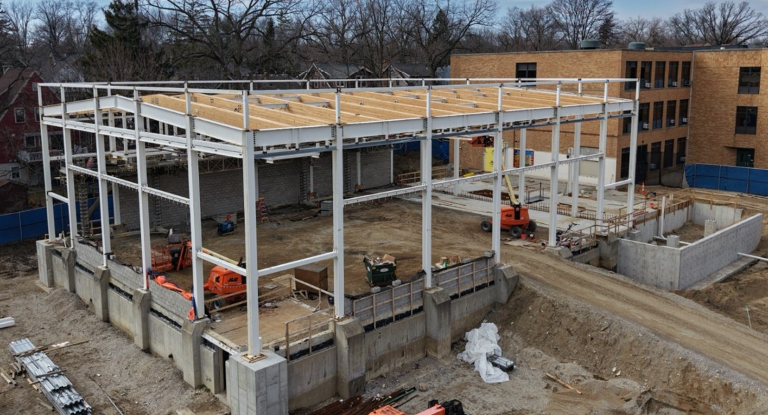 - Steel framework continues in the new locker room.