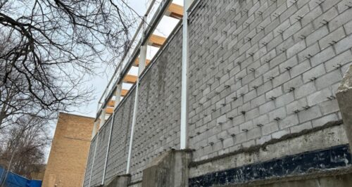 - Masonry work is in progress, west gym wall pictured.